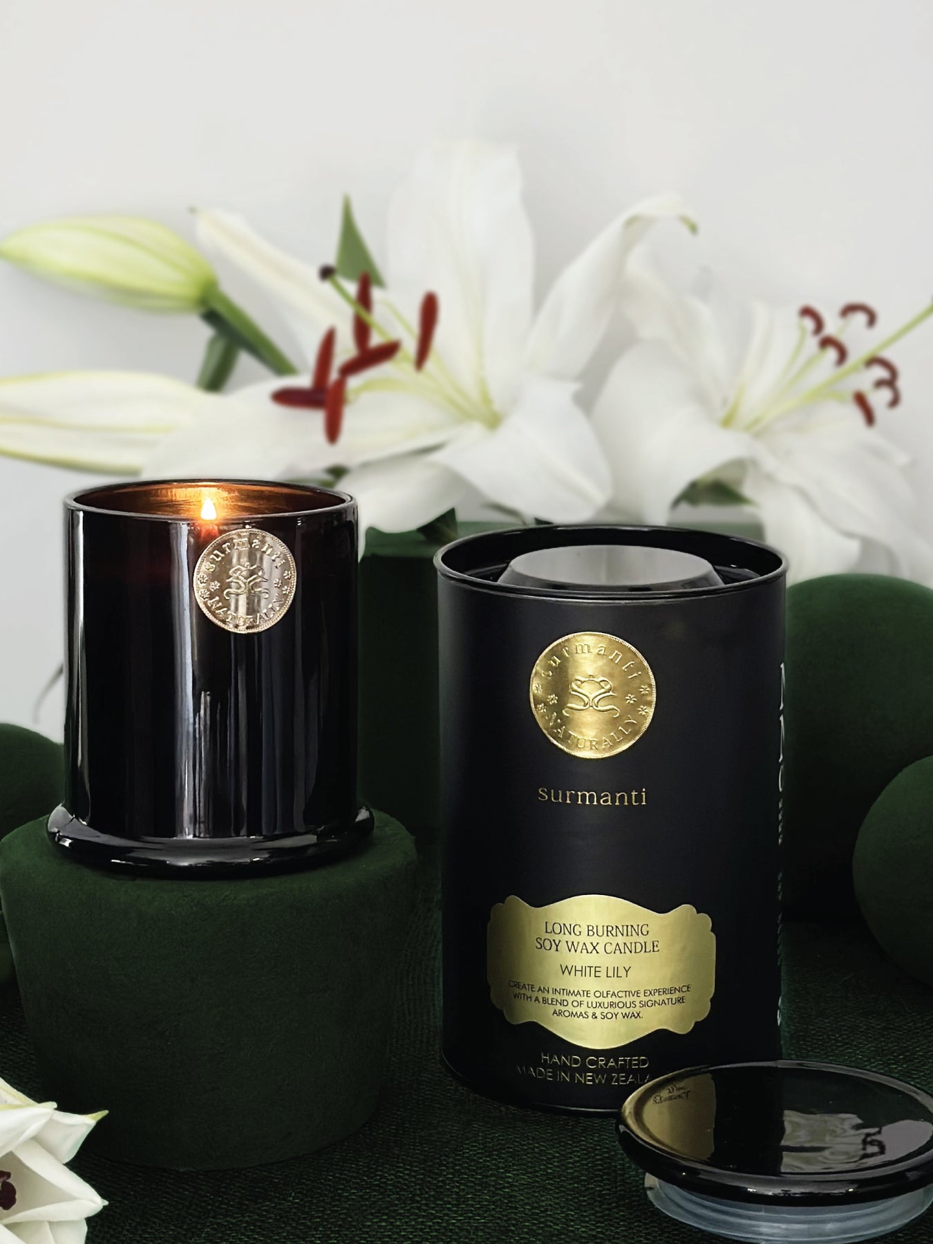 Our candles are an exquisite work of art and the most elegant gift this Christmas. Each candle is uniquely packaged in an elegant black airtight glass jar (as heat, sunlight and air are detrimental to the chemistry and effectiveness of natural products). Housed in a matte black luxury tube with gold hot stamping and a gold embossed Surmanti "signature" coin and at the top, our signature Christmas candles are finished with our signature Christmas bow.