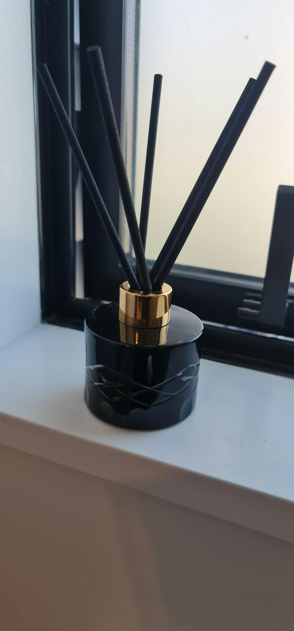 Our luxury collection crystal series vessel is truly a grand centerpiece. With a profusion of multifaceted hand cut crystal patterns, encapsulated in a contrasting black glass background, completed with a gold-plated collar and luxurious black biodegradable reeds.